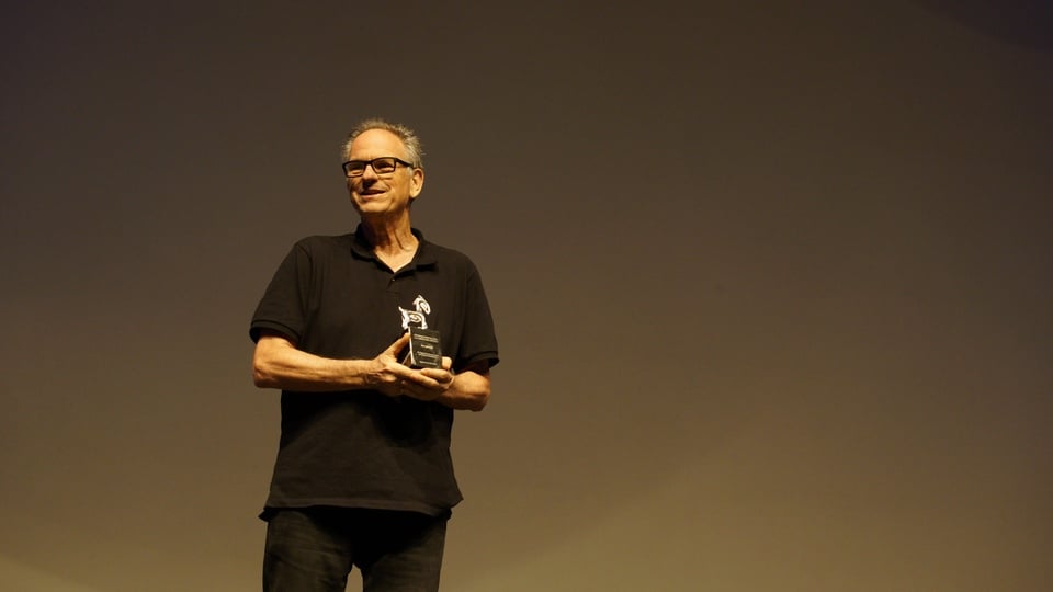 El cineasta emocionado, recibió el Cabrito de Plata de manos del director del FIC, Juan Manuel González, reconocimiento que entrega el certamen a aquellos que por su trabajo a favor de cine son dignos de celebrar.