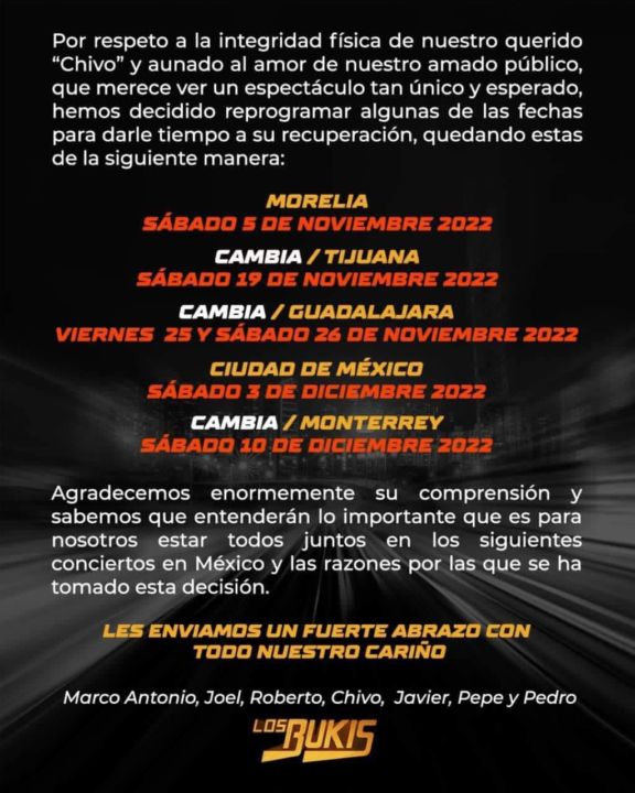 «Con respecto a la integridad física de nuestro querido ‘Chivo’ y aunado al amor de nuestro amado público, que merece ver un espectáculo tan único y esperado, hemos decidido reprogramar algunas de las fechas para darle tiempo a su recuperación» dice el comunicado oficial de «Los Bukis».