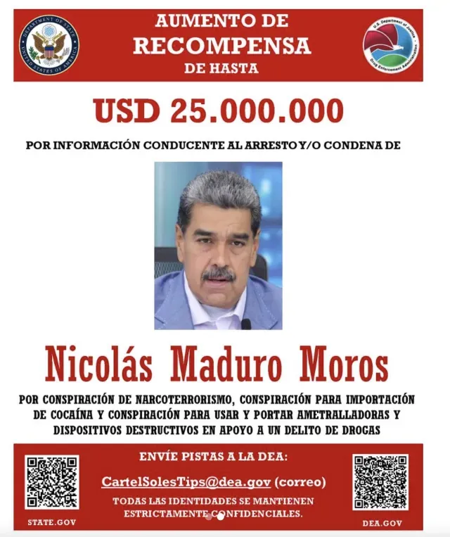La DEA de Estados Unidos ha lanzado una campaña en redes sociales ofreciendo una recompensa de 25 millones de dólares por información que pueda llevar a la captura o condena de Nicolás Maduro, actual Presidente de Venezuela. Esta acción se enmarca dentro de las acusaciones que el Gobierno estadounidense ha hecho contra Maduro, a quien se le identifica como el líder del Cártel de los Soles, una notoria organización criminal vinculada con el narcotráfico y el narcoterrorismo, además de sostener conexiones con grupos terroristas como el Tren de Aragua y el Cártel de Sinaloa.